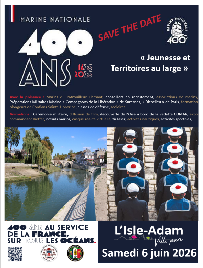 Le samedi 6 juin 2026, la Marine nationale fêtera ses 400 ans d’existence. Plusieurs manifestations, qui seront détaillées prochainement, sont prévues dans la ville de l’Isle-Adam, avec notamment la participation du Cyvia.
